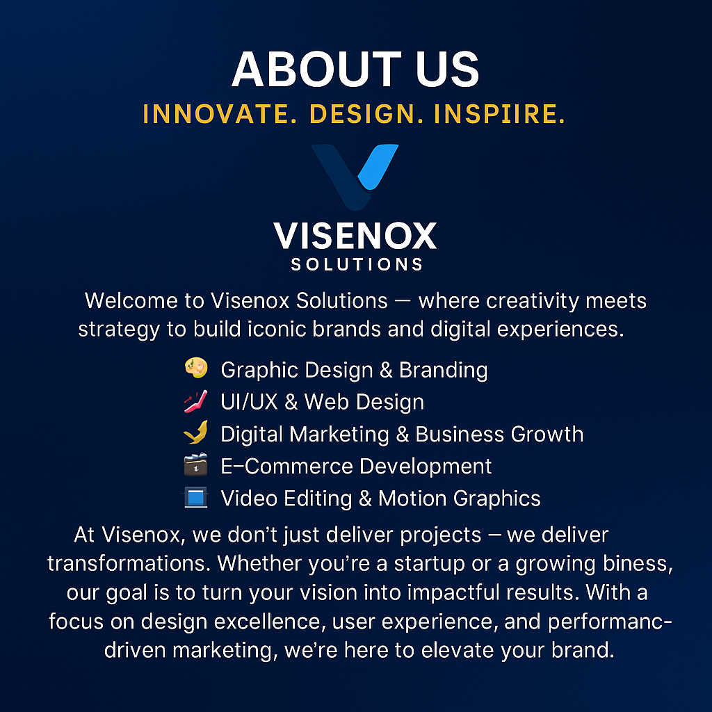 Founded with a passion for design and innovation, Visenox Solutions helps businesses from startups to established brands stand out in today’s competitive digital world. Our mission is simple: turn ideas into visual stories that engage, influence, and grow.